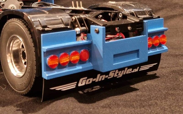 Mooie 3d geprinte oldskool achterbumper met 8x ronde lampen die geschikt is voor de 1/14 Tamiya vrachtwagens. 4x2 geen 6x4
